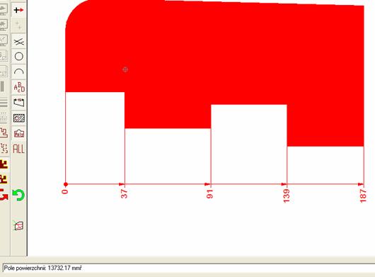 Po wyborze konturem (np. pola obliczanej powierzchni), kontur zostanie zaznaczony grubszą czerwoną linią, a punkty załamania - kropkami.