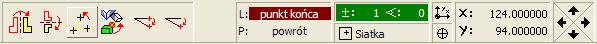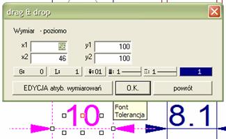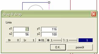 Zmieniono funkcję DRAG&Drop. Aktualnie pozwala na wybór wielu elementów. Na pierwszym wybranym elemencie są zaznaczane punkty charakterystyczne (np. na odcinku: końce i środek). Przy wyborze tylko jednego elementu można go - oprócz przesuwania/kopiowania - rozciągać. Mamy też dostęp do atrybutów elementu oraz możliwość ich zmiany - przy kursorze (kiedy najedziemy na zaznaczony element) pojawia się literka "i". Na rysunku przedstawiono efekt osiągnięty po powtórnym kliknięciu na element.