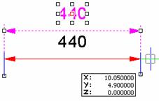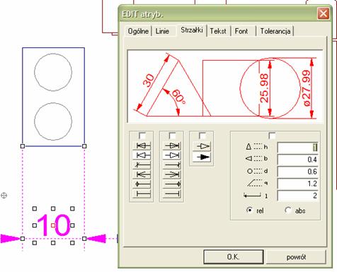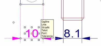 Wybierając jeden z dwóch punktów (w elipsach na rys. poniżej), mamy możliwość zmiany położenia wymiaru: bliżej lub dalej od wymiarowanego obiektu.