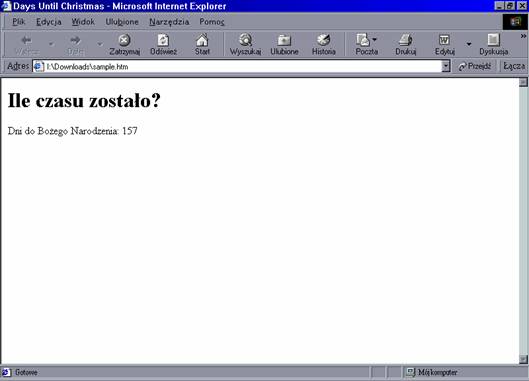 Kompilator ASP widzi znacznik <% i wie, że wszystko, co znajduje się pomiędzy nim a znacznikiem %>, jest kodem wymagającym przetworzenia. W tym przypadku korzystamy z metody o nazwie Write obiektu Response w celu wysłania wyniku do przeglądarki (obiekt ten zostanie szczegółowo omówiony w rozdziale 6.). Szczególną wartością wysłaną do przeglądarki jest liczba dni do Bożego Narodzenia, powstała po odjęciu liczby od siebie dni pozostałych pomiędzy aktualną datą a datą tegorocznego święta.