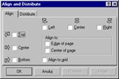 W środkowej części okienka istnieje mosliwość ustalenia wyrównania względem środka strony (Center of page) bądź jej krawędzi (Edge of page); mosesz wtedy zaznaczyć np. takie wyrównanie, aby obiekty miały prawą krawędź dosuniętą do środka strony. Uwasaj jednak z wyrównywaniem całego stworzonego rysunku pośrodku strony (lub krawędzi kartki), gdys zmiana będzie dotyczyć kasdego obiektu z osobna, tak więc wszystkie obiekty zostaną umieszczone w środku strony. Aby zachować układ obiektów, powinieneś je najpierw zgrupować.