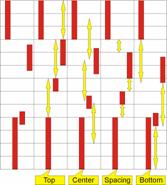 w jednakowe odstępy (Spacing) – nastąpi takie rozmieszczenie obiektów, aby odległości pomiędzy ich krawędziami były jednakowe (na rysunku obok[E20], odległość pomiędzy krawędziami prostokątów wynosi 1 jednostkę);