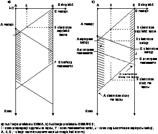 e) czas ti jest wyznaczony z zależności ti=riS, przy czym ri jest liczbą losową z przedziału <0; 2k-1>, k=min, a S jest wartością tzw. szczeliny czasowej. Jak widać preferowani są ci uczestnicy kolizji, którzy zrealizowali mniejszą liczbę prób dostępu;