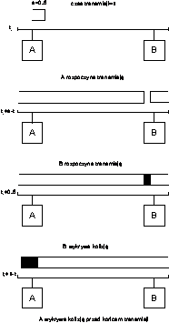 c) pierwsza próba nadawania ramki jest podejmowana po otrzymaniu przez podwarstwę dostępu odpowiedniego żądania, a ewentualne dalsze próby zgodnie z niżej opisanymi założeniami. W sytuacji, w której spełniony jest warunek b), ale po rozpoczęciu nadawania w ramach i-tej próby zostaje wykryta kolizja, po okresie wymuszenia kolizji stacja zawiesza swą aktywność na czas ti po czym ponownie podejmuje próbę nadawania;