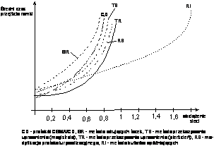 Poniżej przedstawiono typowe orientacyjne szkice charakteryzujące wartość średniego czasu przejścia ramki przez sieć (oczekiwanie na dostęp łącznie z transmisją) w zależności od obciążenia sieci (stosunek ilości informacji zleconej do przesłania w jednostce czasu do szybkości transmisji w łączu).