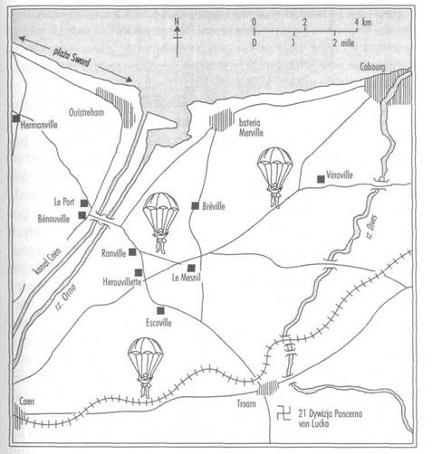 Hickman, sam będąc spadochroniarzem, także usłyszał przelatujące nisko samoloty. I doszedł do takiego samego wniosku, co von Luck - to zaopatrzenie dla francuskiego ruchu oporu. Nie przyszło mu do głowy, że alianci mogą dokonać zrzutu spadochroniarzy, angażując do tego zaledwie kilka maszyn. Hickman pojechał dalej w stronę mostu nad kanałem Caen.