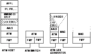 Na rysunku przedstawiono architekturę emulacji LAN w sieciach ATM.