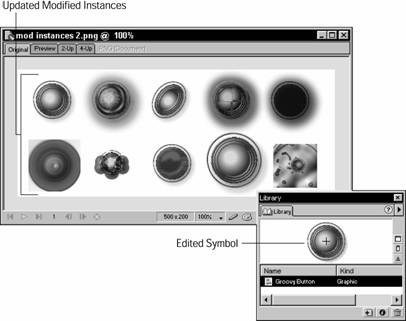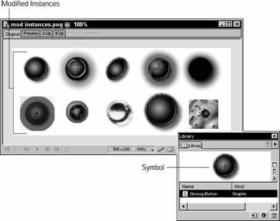Modyfikowanie symbolu pociąga za sobą zmiany wszystkich jego kopii, ale możesz także modyfikować pojedyncze kopie. Fireworks traktuje kopie jako grupy obiektów i pozwala na ich przekształcanie. Wzajemne relacje pomiędzy przekształceniami zastosowanymi do symboli i tymi zastosowanymi do kopii są takie same jak pomiędzy zastosowaniem przekształceń do pojedynczych obiektów, które są następnie grupowane i zastosowaniem przekształceń od razu do całej grupy. Po zerwaniu połączenia kopii z oryginalnym symbolem zachowuje się ona jak grupa obiektów.