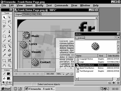 Fireworks umieści oryginalny obiekt w palecie Library, zaś w oknie dokumentu pozostawi jego kopię. Można ją rozpoznać po małej strzałce umieszczonej wewnątrz jej ramki ograniczającej.
