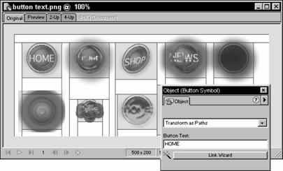 Oprócz standardowych, modyfikowalnych właściwości, takich jak krycie i efekty, kopie przycisków posiadają dwie dodatkowe właściwości: tekst przycisku (Button Text) oraz łącze przydzielone do plastra przycisku (rysunek 17.12). Obie właściwości można modyfikować po zaznaczeniu kopii przycisku w palecie Object. Pozwala to na przydzielenie każdej kopii przycisku innego adresu URL i innego tekstu.