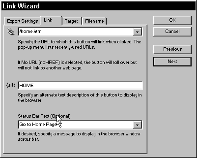 Okno Link Wizard umożliwia modyfikowanie takich właściwości kopii przycisku, które normalnie stosowane są tylko w plastrach. Okno dialogowe z zakładkami, wyświetlane po kliknięciu przycisku Link Wizard, znajdującego się w palecie Object, poprowadzi Cię przez wszystkie etapy edycji właściwości łącza wybranej kopii przycisku.