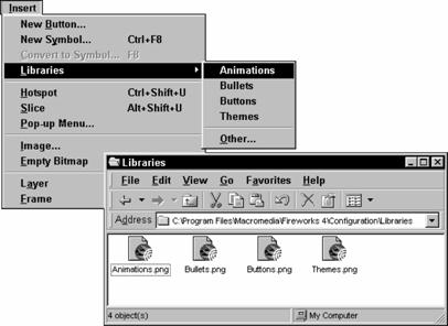 Wybierz bibliotekę z podmenu Insert Libraries, aby ją zaimportować. W podmenu tym znajdują się wszystkie biblioteki obecne w katalogu bibliotek Fireworks (rysunek 17.15). Znajduje się on w katalogu Configuration, wewnątrz katalogu programu Fireworks. Po umieszczeniu biblioteki w formacie PNG w tym katalogu i ponownym uruchomieniu Fireworks, biblioteka będzie dostępna w podmenu Insert Libraries. Jeżeli często korzystasz z tego samego zestawu bibliotek, umieszczenie ich w tym podmenu pozwoli Ci zaoszczędzić wiele czasu.
