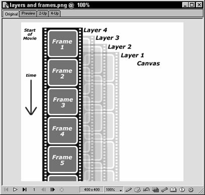 Warstwy animacji można porównać do kilku różnych taśm filmowych sklejonych razem. Gdy włączysz odtwarzanie animacji, wszystkie warstwy znajdujące się w klatce 1. zostaną jednocześnie wyświetlone na ekranie, następnie pojawią się warstwy klatki 2., później klatki 3. itd. Podobnie jak w przypadku statycznych dokumentów Fireworks, warstwy umożliwiają organizowanie kolejności obiektów oraz utrzymywanie różnych obiektów z dala od siebie (na odrębnych warstwach), aby można je było łatwiej edytować. Gdy dodajesz nową warstwę do dokumentu, to tak, jakbyś dodawał całą nową taśmę filmową do istniejącego stosu taśm. Zmiana kolejności warstw w palecie Layers jest podobna do zmiany kolejności naklejania na siebie taśm znajdujących się w stosie.
