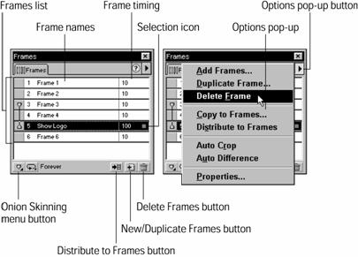 u Paleta Frames (Klatki). Centrum zarządzania większością właściwości animacji, w którym możesz manipulować pojedynczymi klatkami (jak reżyser edytuje poszczególne klatki filmu): dodawać je, usuwać, zmieniać kolejność oraz definiować czas trwania poszczególnych klatek.