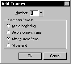 Rysunek 23.3. Okno dialogowe Add Frames daje możliwość precyzyjnej kontroli nad liczbą i położeniami wstawianych klatek |