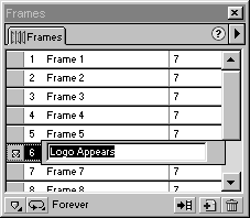 Fireworks 4 umożliwia wprowadzanie nazw opisowych dla klatek w palecie Frames. |