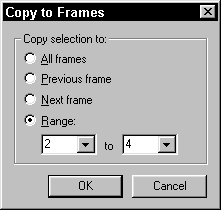 2. Wpisz numery duplikowanych klatek w polu dialogowym Number lub wybierz maksymalnie 10 klatek za pomocą suwaka. 3. Wybierz położenie duplikowanych klatek. Dostępne opcje to: At the beginning (Na początku), Before current frame (Przed bieżącą klatką), After current frame (Po bieżącej klatce) i At the end (Na końcu). Kliknij przycisk OK Klatki zostaną zduplikowane, a kopie umieszczone w określonym miejscu listy palety Frames Animowanie obiektówWażną częścią tworzenia animacji jest zarządzanie wyglądem zmieniających się w czasie obiektów dokumentu. Jeżeli tworzysz prosty animowany wschód słońca, animacja rozpoczyna się od słońca położonego u dołu obszaru roboczego, które następnie przesuwa się w miarę upływu czasu (przez dziesięć kolejnych klatek) do wyższego położenia w obszarze roboczym. W tym samym czasie przesuwać się mogą także chmury, podczas gdy ziemia i niebo pozostają nieruchome. Na pewno nie będziesz chciał rysować każdego z tych obiektów po kilka razy. Nie dość, że przysporzyłoby Ci to mnóstwo dodatkowych zajęć, to jeszcze przypuszczalnie każdy z obiektów byłby nieco inny. Jeśli wygląd słońca zmieniałby się w każdej klatce, znikłoby wrażenie ruchu, a pojawiłby się oczywisty obraz "podmieniania" obiektów. Podczas tworzenia animacji utwórz raz wszystkie potrzebne obiekty, a następnie kopiuj lub rozkładaj je na poszczególne klatki. Następnie kopie obiektów możesz przesuwać lub modyfikować, aby uzyskać wrażenie obiektów poruszających się lub zmieniających w czasie. Przechowywanie podobnych obiektów na ich własnych warstwach pozwoli Ci pracować jedynie z wybranymi obiektami i łatwiejsze kopiowanie ich do kolejnych klatek. W przykładzie animowanego wschodu, słońce możesz przechowywać na jednej warstwie, na innej chmury i na jeszcze innej statyczne obiekty tła. Kopiowanie obiektów do klatekW większości przypadków będziesz dodawał obiekty do innych klatek poprzez ich kopiowanie. Aby skopiować obiekt lub obiekty do innej klatki: 4. Zaznacz obiekt(y). 5. Wybierz polecenie Copy to Frames (Kopiuj do klatek) z rozwijanego menu palety Frames Fireworks wyświetli okno dialogowe Copy to Frames (rysunek 23.5). 6. Wybierz położenie kopiowanych obiektów. Dostępne opcje to: All frames (Wszystkie klatki), Previous frame (Poprzednia klatka), Next frame (Następna klatka) lub Range (Zakres klatek), która umożliwia zdefiniowanie określonego zestawu klatek. Kliknij przycisk OK