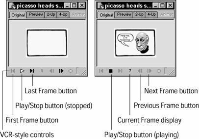 Kontrolki animacjiW trakcie budowania animacji w Fireworks na pewno będziesz chciał ją odtworzyć, aby zobaczyć, jak wyglądają zmiany pomiędzy klatkami. Fireworks oferuje kontrolki przypominające przyciski magnetowidu, znajdujące się u dołu okna dokumentu, które umożliwiają podgląd animacji (rysunek 23.6).