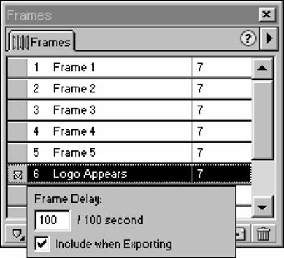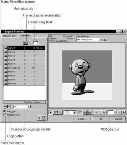 Niektóre kontrolki palety Frames - na przykład tempo animacji - znajdują się również w oknie dialogowym Export Preview. |