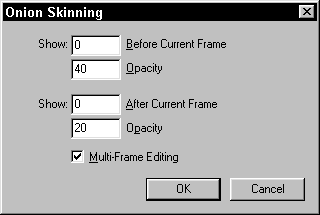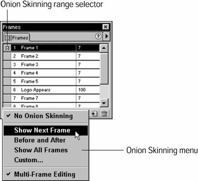 Przycisk Onion Skinning znajdujący się w lewym dolnym rogu palety Frames daje dostęp do rozwijanego menu Onion Skinning (rysunek 23.8) i możliwość wyboru wyświetlanych klatek. Możesz zdefiniować dowolny zakres lub wszystkie klatki animacji.
