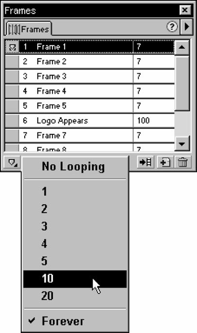 u Auto Difference (Automatyczna różnica). Przekształca niezmieniające się piksele w obszarze Auto Crop na przezroczystość, co niekiedy umożliwia jeszcze większe zredukowanie rozmiaru pliku. Opcje Auto Crop i Auto Difference mogą być włączane i wyłączane za pomocą rozwijanego menu palety Frames lub w zakładce Animation okna dialogowego Export Preview ZapętlanieZapętlanie jest funkcją dość prostą w stosowaniu. Każdy animowany GIF może być odtwarzany dowolną ilość razy lub ustawiany na ciągłe zapętlanie, a to oznacza, że nigdy nie będzie zatrzymywany. Jeżeli ostatnia klatka animacji jest dobrze wyglądającym punktem końcowym, najlepszym rozwiązaniem jest ustawienie animacji na zapętlanie skończoną liczbę razy. Przy tworzeniu animowanych rolloverów najlepszym rozwiązaniem jest ustawienia "wiecznego" zapętlania. Umieść kursor nad animowanym GIF-em, który jest odtwarzany tylko jeden raz, a być może stwierdzisz, że nie jest on odtwarzany w ogóle lub tylko połowicznie. Różne przeglądarki internetowe inaczej traktują przeładowywane animowane GIF-y. Aby zmienić ustawienia zapętlania animowanego GIF-a, wykonaj jedną z poniższych czynności: u Wybierz opcję No Looping (Brak zapętlania), określoną liczbę lub opcję Forever (Ciągłe zapętlanie) z menu Looping w palecie Frames (rysunek 23.11).