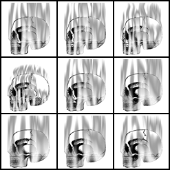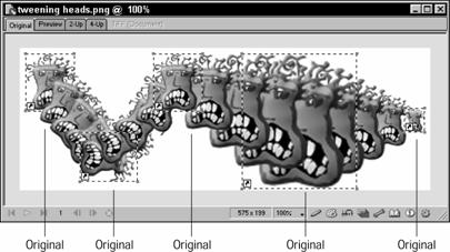 Dwie lub więcej kopii tego samego symbolu może być automatycznie sekwencjonowane przez Fireworks. Sekwencjonowanie jest terminem używanym w animacji i oznaczającym generowanie pośrednich klatek pomiędzy dwoma obrazkami, w celu utworzenia łagodnego przejścia jednego obrazka w inny. Wystarczy, że utworzysz w Fireworks początkowy i końcowy punkt sekwencji, a program automatycznie utworzy wszystkie kroki pośrednie. Każda nowo tworzona kopia jest lekko modyfikowana w stosunku do poprzedniej, co powoduje powstanie efektu ewoluowania pierwszej kopii do ostatniej. Możesz również sekwencjonować więcej niż dwie kopie (rysunek 23.13). W takim przypadku o każdej kopii powinieneś myśleć jako o kluczowej klatce animacji.