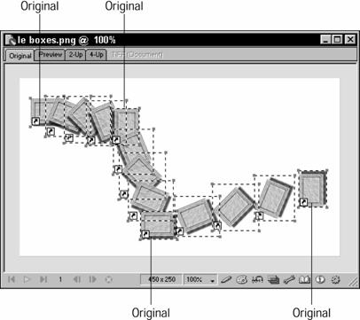 49. Utrzymując zaznaczenie wszystkich kopii, kliknij znajdujący się w palecie Frames przycisk Distribute to Frames (ikona taśmy filmowej). Wszystkie kopie zostaną rozłożone na klatki, aby utworzyć animację taką, jak przedstawiona na rysunku 23.16. Możesz obejrzeć utworzoną animację za pomocą kontrolek dostępnych u dołu okna dokumentu. Możesz także wybrać z menu polecenie File Export Preview i obejrzeć animację w oknie dialogowym Export Preview lub sprawdzić jej działanie w przeglądarce internetowej za pomocą polecenia File Preview in Browser