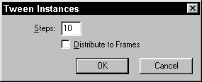 Po ustaleniu właściwej kolejności w stosie sekwencjonowanych obiektów, musisz również zdecydować, ile kroków pośrednich powinien utworzyć Fireworks pomiędzy poszczególnymi obiektami. Ponownie przyjrzyj się rysunkowi 23.13. W tym sekwencjonowaniu wykorzystane zostały trzy kroki, więc Fireworks pomiędzy oryginalnymi kopiami utworzy trzy obiekty pośrednie. Do tej pory sekwencjonowaliśmy obiekty i tworzyliśmy pojedynczą klatkę przedstawiającą obiekty rozłożone na całym obszarze roboczym. Zazwyczaj jednak, aby utworzyć prawdziwą animację, będziesz musiał rozłożyć sekwencjonowane obiekty do różnych klatek. Możesz to zrobić w trakcie sekwencjonowania lub w dowolnym momencie zaznaczyć sekwencjonowane obiekty i kliknąć w palecie Frames przycisk Distribute to Frames. Fireworks rozłoży obiekty na klatki, rozpoczynając od obiektu znajdującego się na spodzie stosu, czyli tak samo jak wykonywane jest sekwencjonowanie. Zachowana zostanie więc właściwa kolejność obiektów. Aby sekwencjonować kopie: 31. Utwórz obiekt lub grupę obiektów, a następnie przekształć je na symbol. Zaznacz w tym celu obiekt i wybierz z menu polecenie Insert Convert to Symbol. Wpisz nazwę symbolu w oknie dialogowym Symbol Properties i kliknij przycisk OK. Obiekt zostanie przekształcony na symbol i zapisany w bibliotece. W obszarze roboczym pozostanie kopia tego symbolu. 32. Wybierz z menu polecenie Edit Duplicate lub użyj skrótu klawiaturowego Ctrl+Alt+D Command+Option+D), aby utworzyć nową kopię. Duplikat kopii jest również kopią. Pamiętaj, że kopia będzie się znajdowała wyżej w stosie obiektów niż oryginał. 33. Umieść duplikat kopii w miejscu, w którym ma się kończyć sekwencja. 34. Zaznacz obie kopie, rysując wokół nich ramkę selekcji lub klikając je kolejno z wciśniętym klawiszem Shift 35. Wybierz z menu polecenie Modify Symbol Tween Instances Fireworks wyświetli okno dialogowe Tween Instances (rysunek 23.15).
