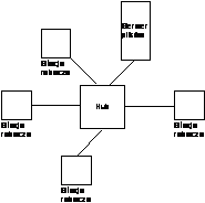 Sieć zawiera centralny element (hub), do którego przyłączone są wszystkie węzły. Cały ruch w sieci odbywa się przez hub. Sygnały mogą być nadawane z huba do wszystkich stacji lub tylko do wybranych. Odległość każdej stacji od huba oraz liczba stacji do niego podłączonych są ograniczone. Czas propagacji sygnału nie zależy od liczby stacji. Nadane przez hub sygnały zanikają samoczynnie. Możliwe jest wystąpienie kolizji, która może być łatwo wykryta przez hub i zasygnalizowana wszystkim stacjom. Zaletą tej topologii jest łatwość konserwacji, wykrywania uszkodzeń, monitorowania i zarządzania siecią. Awaria jednej stacji nie wpływa na pracę reszty sieci. Układ okablowania jest łatwo modyfikowalny (łatwo dołączyć stację roboczą), ale jego koszt jest stosunkowo duży (potrzeba duże ilości kabla w celu podłączenia każdej stacji osobno). Należy również zauważyć, że hub jest centralnym elementem sieci i jego ewentualna awaria paraliżuje całą sieć.