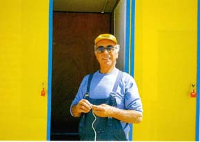 stojący między dwoma skrzydłami jaskrawo żółtych drzwi
