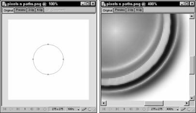 Choć w procesie tworzenia struktury grafiki w Fireworks wykorzystywane są obiekty wektorowe, wszystkie pozostałe elementy tej struktury (obrysy, wypełnienia i efekty) są tworzone z pikseli (rysunek 1.2).