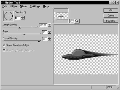Zgodność bitmapJako narzędzie graficzne nowej generacji, Fireworks pozwala na wykorzystywanie obrazków tworzonych we wcześniejszych programach. Wykorzystując szeroki wachlarz filtrów importu, w Fireworks można otwierać i edytować pliki tworzone w programach Photoshop, CorelDraw, FreeHand i wielu innych. Fireworks oferuje kompletny zestaw narzędzi selekcji używanych w pracy z bitmapami: zaznaczenie prostokątne, lasso i różdżkę oraz narzędzia służące do malowania, takie jak ołówek i gumka. Bardzo ważnym elementem każdego programu do tworzenia grafiki bitmapowej są filtry i Fireworks nie odstaje pod tym względem od swoich konkurentów. Oprócz wielu wbudowanych filtrów, takich jak Gaussian Blur (Rozmycie gaussowskie), Invert (Odwrotność) i Sharpen (Wyostrzenie), Fireworks umożliwia wykorzystanie filtrów zgodnych z Photoshopem. W rezultacie, w Fireworks działają wszystkie plug-iny obsługujące standardy Photoshopa, na przykład Kai's Power Tools i Eye Candy firmy Alien Skin oraz rozszerzenia Xenofex. Do Fireworks 4 dołączana jest nawet wersja LE (Limited Edition) pakietu Eye Candy, zawierająca trzy filtry, m. in. filtr Motion Trail (Poruszenie) (rysunek 1.4). Co więcej, w prosty sposób można dołączać wszystkie rozszerzenia różnych firm, które są wykorzystywane w Photoshopie. Wystarczy w tym celu zmienić pojedyncze ustawienie w preferencjach programu.