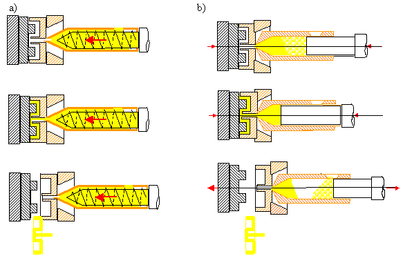 Rysunek. Wtryskiwanie termoplastów: a) ślimakowe, b) tokowe