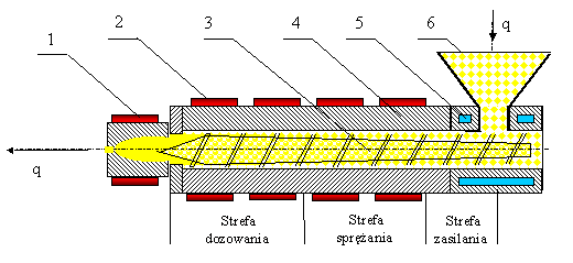 Schemat wyciskarki. 1- głowica, 2- ogrzewanie, 3- ślimak,
