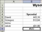 Wartości błędów (rysunek 5.8) - użycie wartości błędów jako argumentów odpowiednich funkcji często umożliwia zlokalizowanie błędu bądź informacji, których brakuje na arkuszu danych.