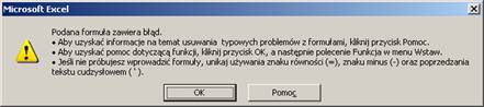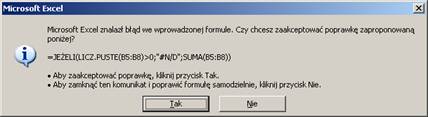 Tworząc formuły wykorzystujące funkcje zagnieżdżone powinieneś zwracać szczególną uwagę na ilość nawiasów - jeżeli pominiesz jakiś nawias to Excel wyświetli komunikat o błędzie (rysunek 5.9) albo okno dialogowe z propozycją poprawienia formuły (rysunek 5.10). Może się również zdarzyć, że Excel automatycznie poprawi błędnie zapisaną formułę nie informując Cię o tym fakcie.
