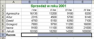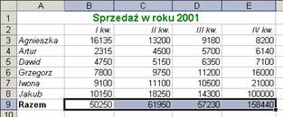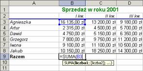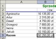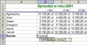 Rysunek 5.1. Zastosowanie funkcji SUMA ułatwia dodawanie zawartości szeregu komórek.