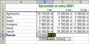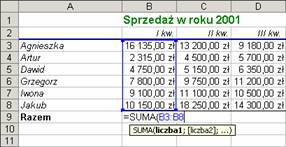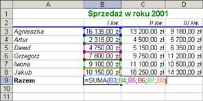 =SUMA(B8:B11) lub =SUMA(B8;B9;B10;B11)