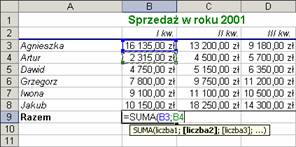 Rysunek 5.5. Argumenty funkcji mogą być zapisywane na różne sposoby, jak to ma miejsce na przykładzie funkcji SUMA