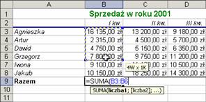 Excel XP posiada nowe udogodnienie - etykiety ekranowe argumentów funkcji (rysunek 5.11 i 5.12), które wyświetlając składnię danej funkcji ułatwiają jej wprowadzenie.