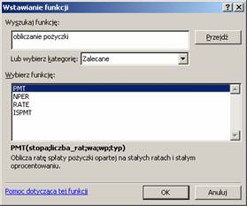Jeżeli nie znasz dokładnej nazwy funkcji, którą chcesz wprowadzić, to możesz spróbować wyszukać taką funkcję na podstawie jej opisu. W tym celu powinieneś wpisać w polu Wyszukaj funkcję krótki opis działania funkcji, a następnie nacisnąć przycisk Przejdź. W oknie Wybierz funkcję, zlokalizowanym poniżej pojawi się lista funkcji, które potencjalnie realizują potrzebną operację (rysunek 5.23).
