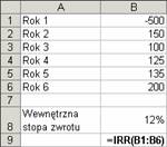 Excel stosuje iteracyjną technikę obliczania wewnętrznej stopy zwrotu i powtarza obliczenia do chwili osiągnięcia wyniku z dokładnością do 0,00001%. Jeśli funkcja IRR nie może znaleźć wyniku po 20 iteracjach, wyświetlana jest wartość błędu #LICZBA!. Jeżeli argument wynik zostanie pominięty, to Excel zakłada, że jego wartość wynosi (10%) - (przyp. tłum.)