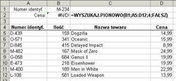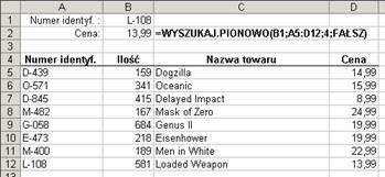 Rysunek 5.64. Przykład zastosowania funkcji WYSZUKAJ.PIONOWO. Po wprowadzeniu wybranej wartości liczbowej w komórce B1, formuła umieszczona w komórce B2 stara się odszukać tą wartość w pierwszej kolumnie tabeli odniesienia (A5:D12). Jeżeli wartość zostanie odnaleziona, to zwracana jest wartość leżąca w czwartej kolumnie wiersza zawierającego odszukaną wartość. Formuła użyta w komórce B2 została przedstawiona w komórce C2