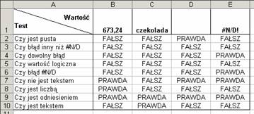 Rysunek 5.66. Kolejne funkcje CZY sprawdzają zawartości komórek umieszczonych w pierwszym wierszu tabeli. Wyniki działania poszczególnych funkcji umieszczone są w komórkach poniżej.