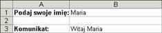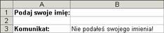 Rysunek 5.67 i 5.68. Prosty przykład zastosowania funkcji CZY: formuła w komórce B3 =JEŻELI(CZY.TEKST(B1);"Witaj "&B1;"Nie podałeś swojego imienia!") strofuje użytkownika, jeżeli nie poda swojego imienia (przykład na górze) lub wyświetla komunikat powitalny (na dole).