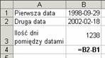 Rysunek 5.70. Obliczanie liczby dni pomiędzy dwiema datami polega na prostym odejmowaniu zawartości dwóch komórek. Formuła użyta w komórce B3 została przedstawiona w komórce B4