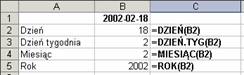 Rysunek 5.72. Funkcje DZIEŃ DZIEŃ.TYG MIESIĄC i ROK zwracają poszczególne fragmenty daty. Formuły użyte w kolumnie B zostały przedstawione w kolumnie C