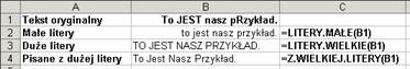 Rysunek 5.73. Przykład zastosowania funkcji LITERY.MAŁE LITERY.WIELKIE i Z.WIELKIEJ.LITERY do zmiany wielkości liter podanego łańcucha. Formuły użyte w kolumnie B zostały przedstawione w kolumnie C