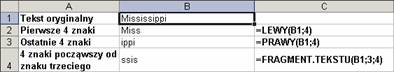 Rysunek 5.74. Przykład zastosowania funkcji LEWY PRAWY i FRAGMENT.TEKSTU do wycinania fragmentów podanego łańcucha. Formuły użyte w kolumnie B zostały przedstawione w kolumnie C