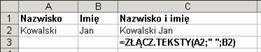 Rysunek 5.75. Przykład zastosowania funkcji ZŁĄCZ.TEKSTY do połączenia dwóch łańcuchów tekstu. Formuła użyta w komórce C2 została przedstawiona w komórce C3